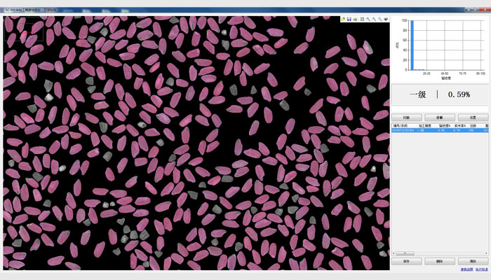 5、多樣的檢測報告直接顯示:留皮度判定結果、留皮度分布直方圖、完整粒分類(整精米率)、碎米率。分析報告輸出數據項可選,可在Excel軟件中進一步統(tǒng)計分析數據。