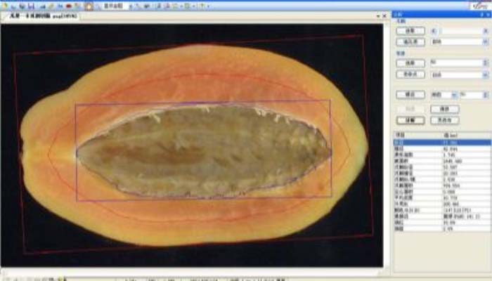 (2)可測哈密瓜等甜瓜的:縱徑、橫徑、果形指數、截面積、肉厚、外周長、瓤色分檔分析、種腔(縱徑、橫徑、面積)。