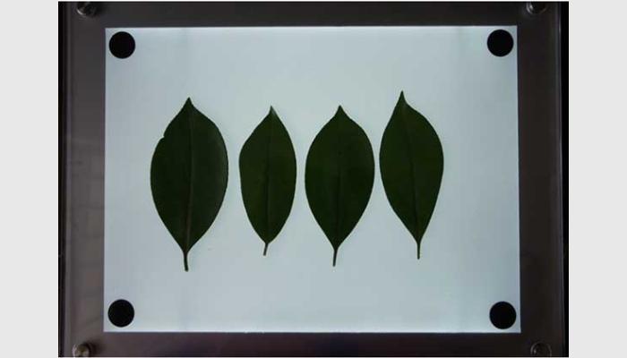 2、拍照與分析一鍵化操作,大批量全自動(dòng)分析多片葉的葉片面積、周長,最大葉長、最大葉寬,矩形度,凹凸比,球狀性,形狀系數(shù),蟲洞數(shù)量,蟲洞面積、葉柄長寬等參數(shù),并標(biāo)記葉片邊緣以便核對(duì)正確性。