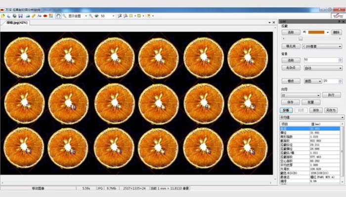 (4)可測柑橘類水果的:縱徑、橫徑、果形指數、總面積、皮厚、肉色分檔分析、外周長。